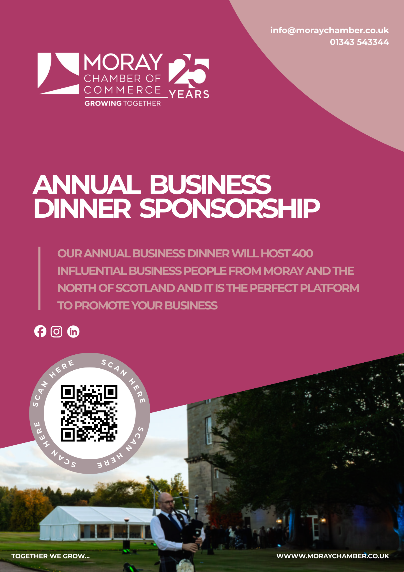 “By sponsoring the Annual Business Dinner, your business becomes part of Moray’s biggest black-tie celebration. We celebrate the people, organisations and ambition driving Moray forward. This is not just sponsorship, it’s a powerful opportunity to showcase your brand, support our business community and being part of an inspirational evening.”