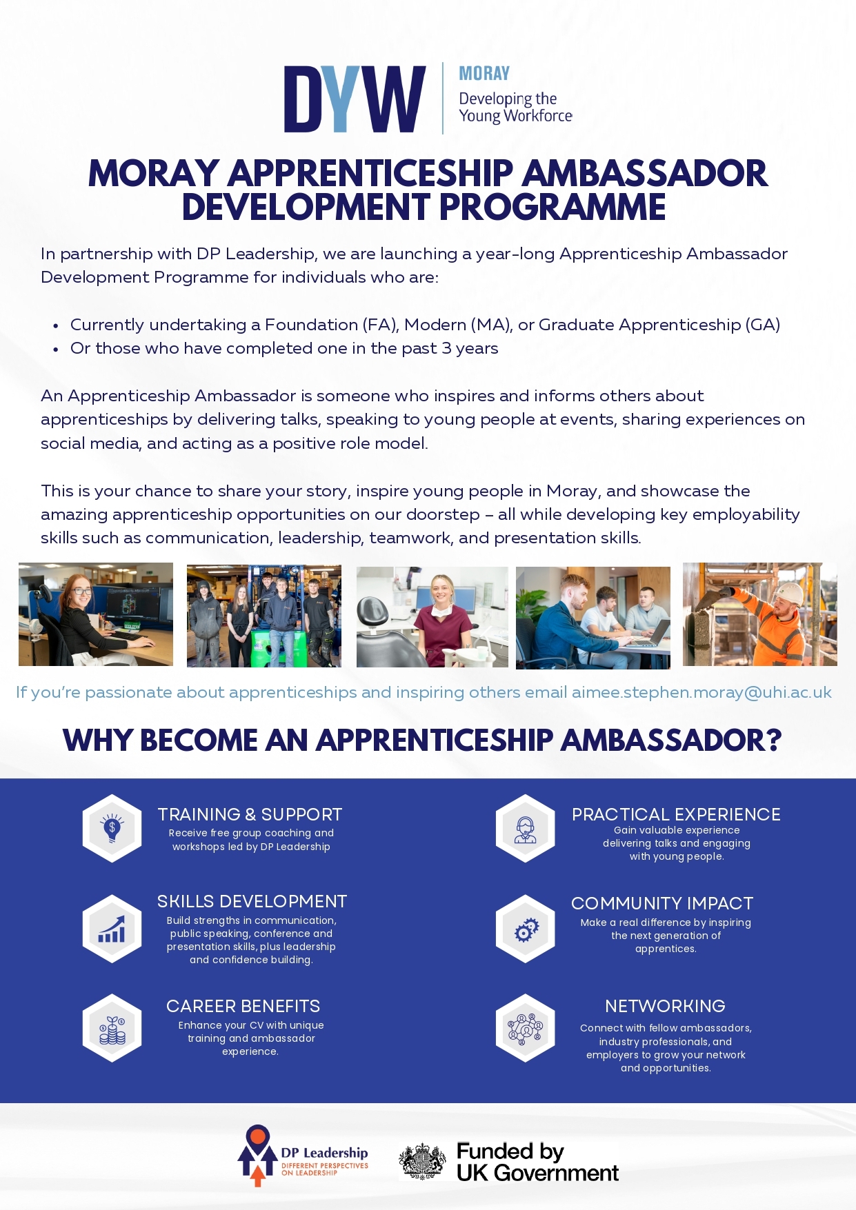 DYW MORAY ARE INVITING EMPLOYERS ACROSS MORAY TO CONSIDER PUTTING FORWARD CURRENT MORAY APPRENTICES (AGED 16–24) OR THOSE WHO HAVE COMPLETED AN APPRENTICESHIP WITHIN THE PAST THREE YEARS TO TAKE PART IN OUR NEW APPRENTICESHIP AMBASSADOR DEVELOPMENT PROGRAMME.