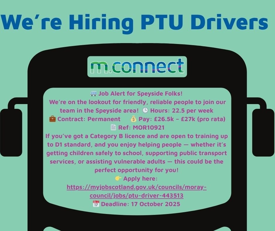 Moray Council is recruiting part-time Passenger Transport Unit (PTU) drivers to support community transport services. The role involves safely transporting school pupils, elderly, disabled, and vulnerable adults, as well as assisting with non-emergency patient transport.